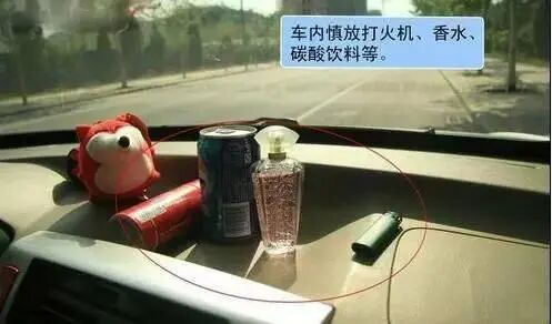 3、注意危险物品:打火机、空气清新剂、真空铝罐包装的化妆品、香水、摩丝等受热容易膨胀爆炸,最好不要放在车内。